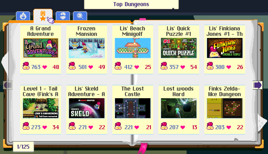 The first major part of Super Dungeon Maker is the ability to play and download other bespoke dungeons created by the community. In the Hub World, you can enter two different buildings to experience the multitude of custom made dungeons. The Eggspedia lets you view and play any community created dungeon. Here you can view multiple catagories like Top Dungeons or New Dungeons or even search for specific Dungeons. You can view the Dungeon, how many ‘hearts’ it has, play directly from here and give it a ‘heart’ yourself. You can also download the game so that you can access it at a later time without returning to to the Eggspeida. This is where the Storegge Room comes in as it allows you to view a collection community games that you’ve downloaded and return to over and over again. There’s an immense amount of creativity out there and it’s fun to play such a wide variety of other dungeons to get inspiration from or just spend countless hours exploring the imaginative designs of others.